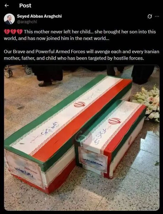 伊朗外长阿拉格齐发了一条推文,配图是一大一小两口棺木,里面是被炸死的妈妈和她的孩子。