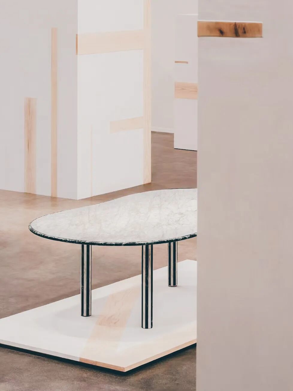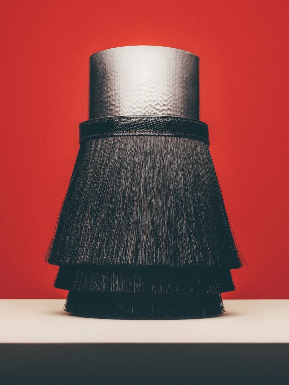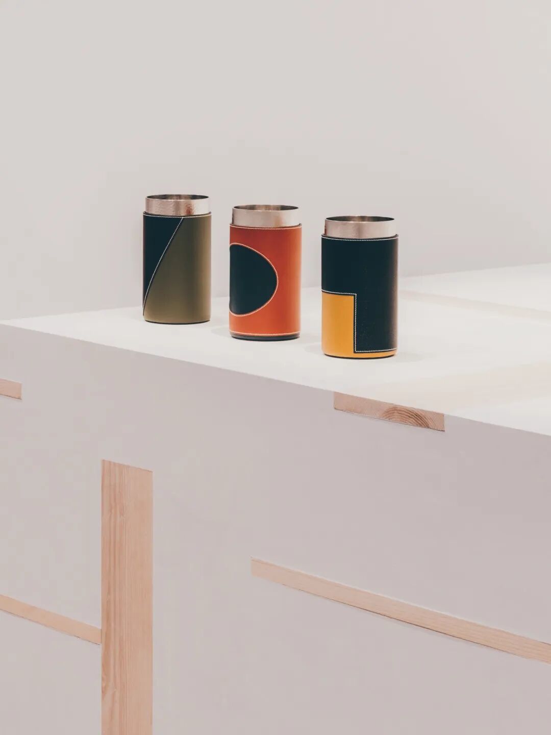 本次系列强调材质与手工艺的融合,并用家居物件作品进行表达,爱马仕相信家居并非静态容器,而是一种持续被构建的秩序与方式。羊绒与亚麻织物以拼接形式呈现,展现出通透质感、层叠褶皱与隐约线条的交织意趣;金属与皮革器物通过几何结构建立材质对比,在光线变化下,可以看到细腻的细节处理。展厅中央的大理石桌作品也值得我们关注,某种程度上成为材质与工艺的锚点。