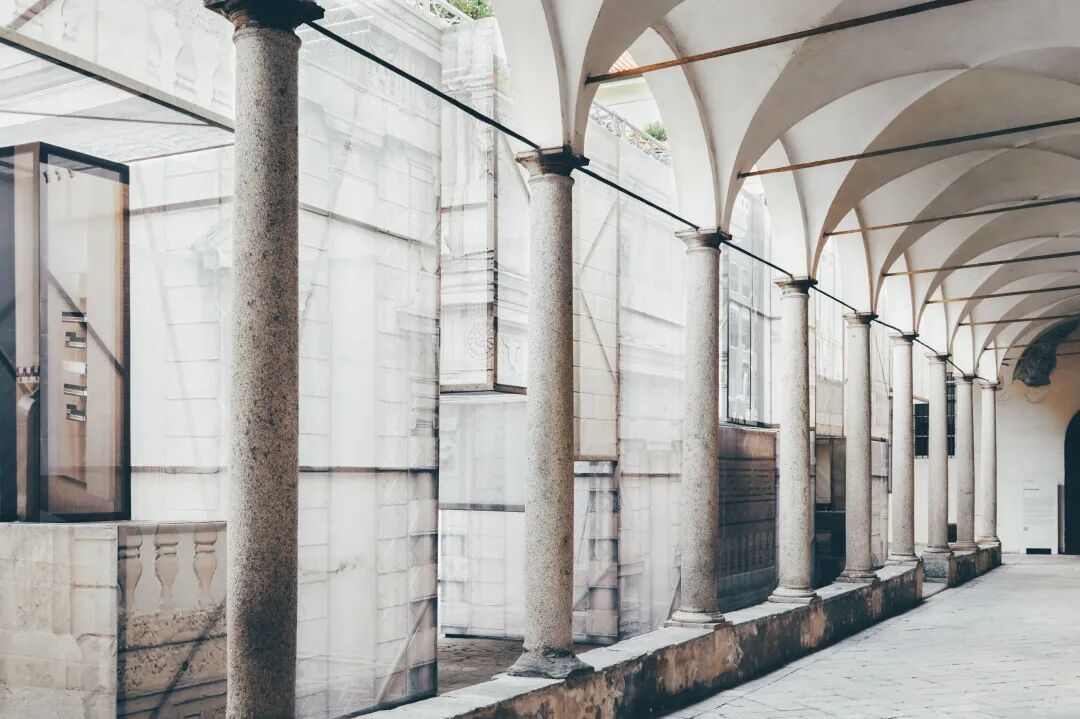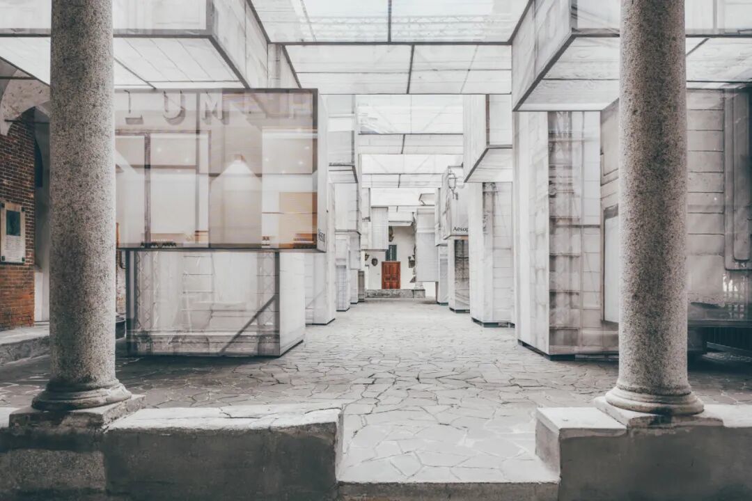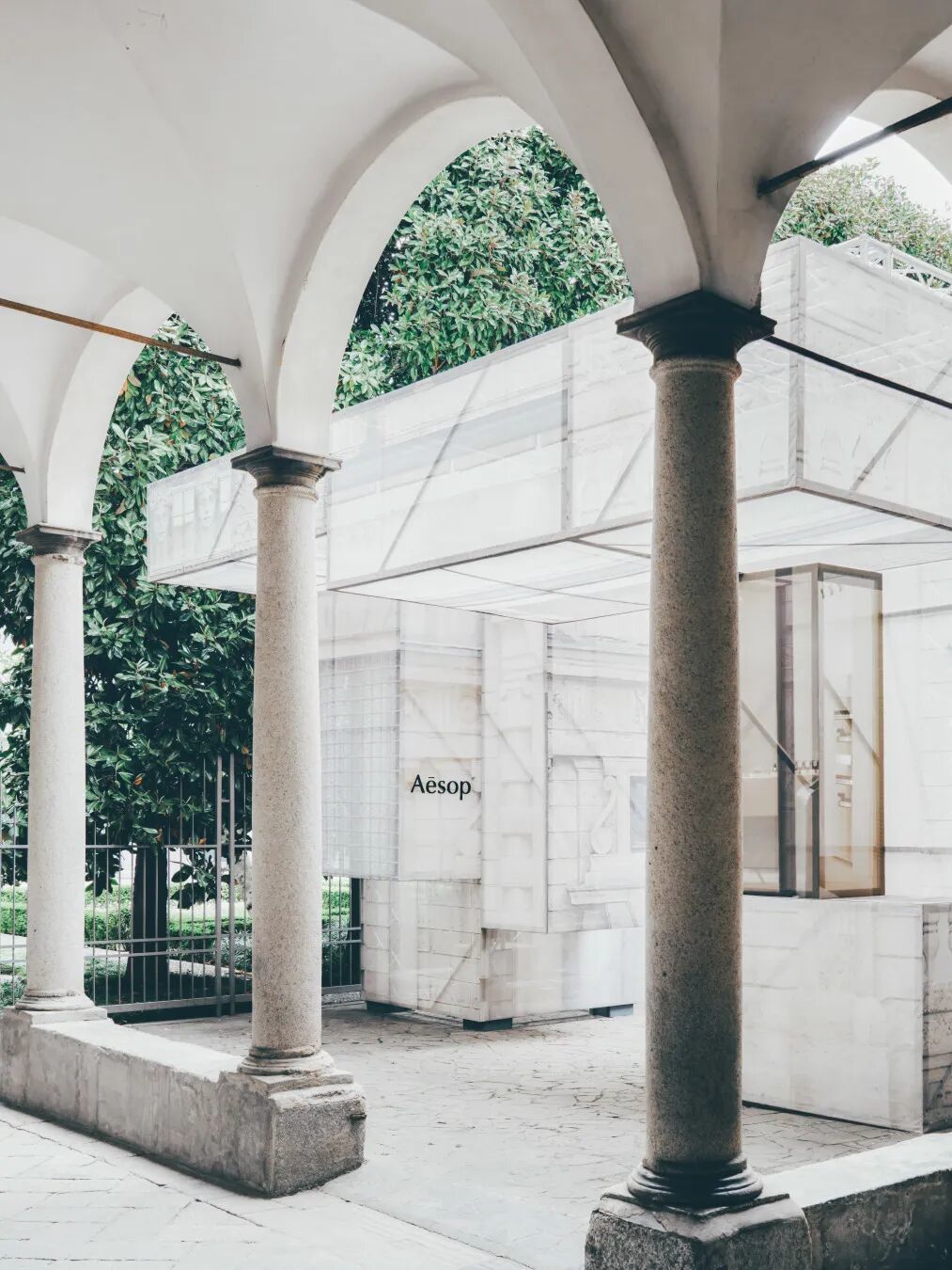 Aesop米兰设计周展厅外,圣母圣衣教堂外立面正在维修,而展厅内的装置,正是由这些修复废料(回收的棚架和布料)组成,Aesop把工程中这些人为的痕迹带进了建筑艺术的语境里。