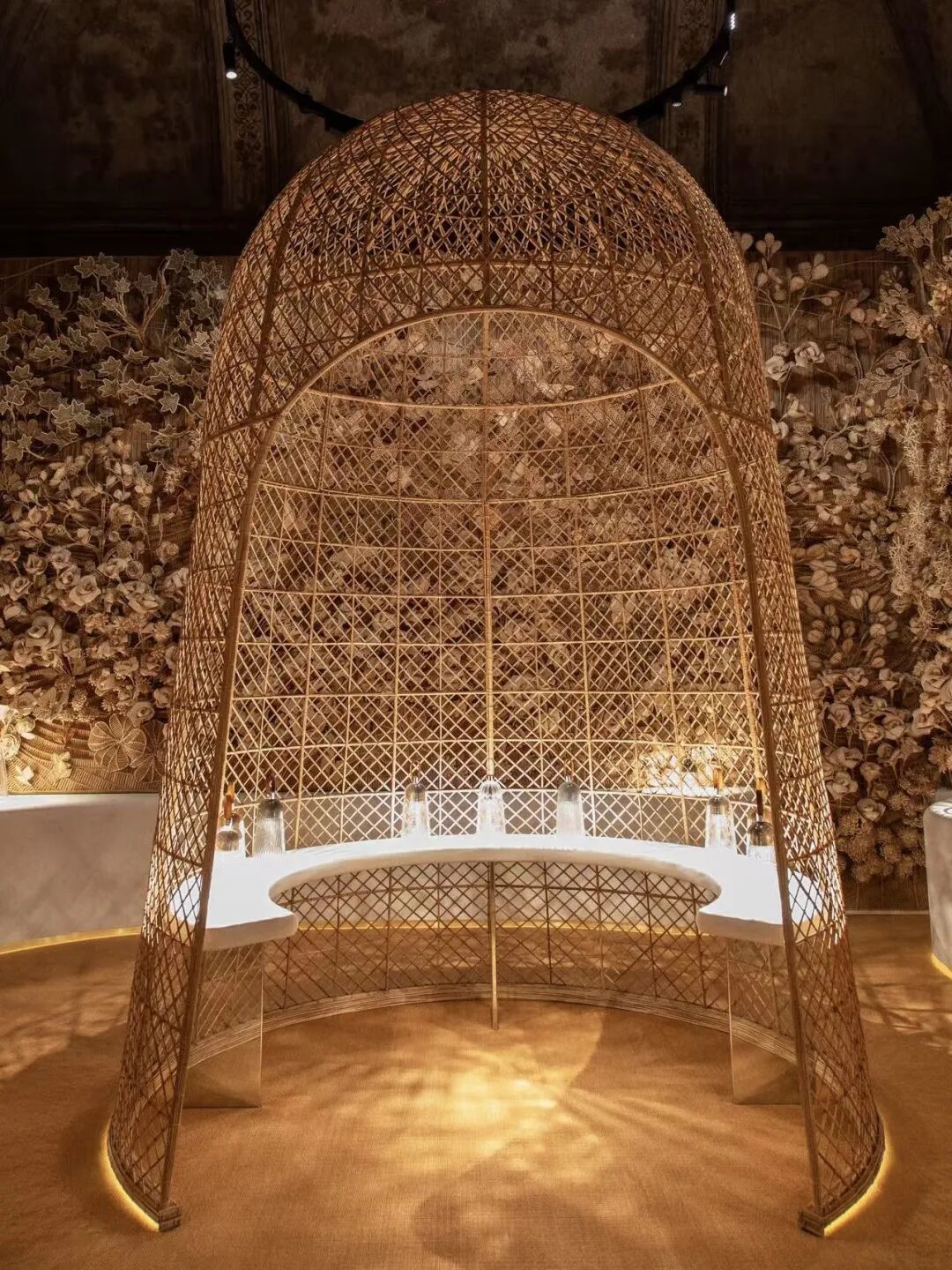 瑰丽品牌以“物件有声”为题,把视线从宏大的叙事中抽离出来,落在更具体、也更感性的层面。高挑空间中,灯具以近乎“生长”的姿态排列:和纸的柔软、石材的重量、植物的轻微介入,让这些作品看起来像是介于设计与自然之间的存在。它们不强调逻辑,也不急于解释。在空间里,光线本身就是一种语言。