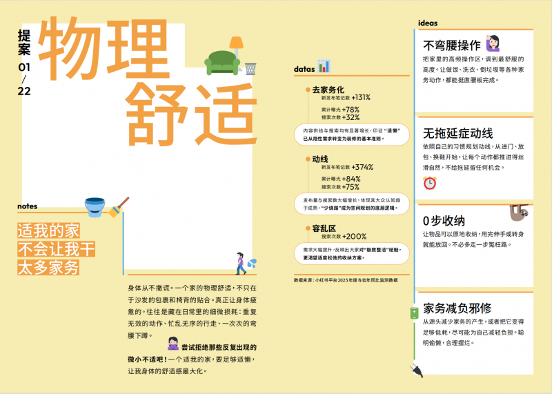 在《家的100个适我主义提案》中,这种主体性的回归,通过具体的居住场景得到了充分验证。首先是提升生活效率、追求物理舒适的“适懒化”:过去一年中,小红书关于“去家务化”的新发布笔记数同比增长了131%,“动线”相关的搜索次数提升了75%。用户不再一味追求极致的整洁,而是通过“不弯腰垃圾桶”、规划“容乱区”以及构建“无拖延症动线”,从源头降低家务负担。
